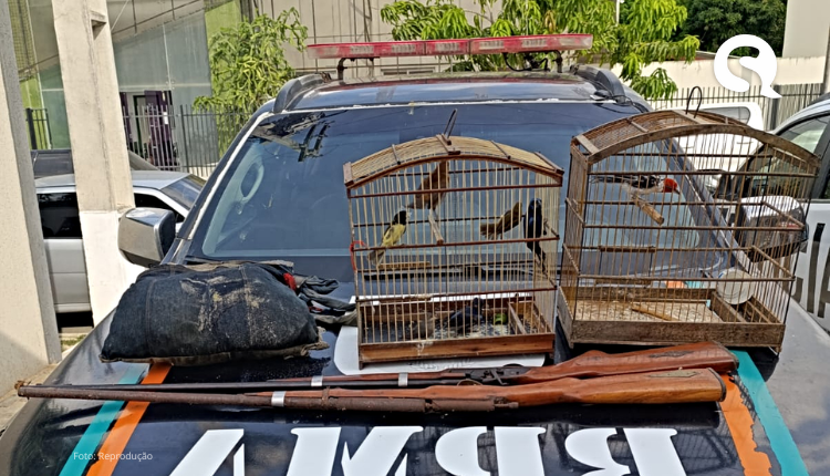 Na casa, os policiais encontraram uma mulher, que informou que o marido possuía armas de fogo e criava pássaros na residência. Com as buscas, os agentes apreenderam duas espingardas artesanais, um recipiente com espoletas, pólvora, chumbo, além de sete pássaros silvestres – sendo um galo de campina, um laço-de-fita, dois papa-capins e três azulões, e um macaco-prego.