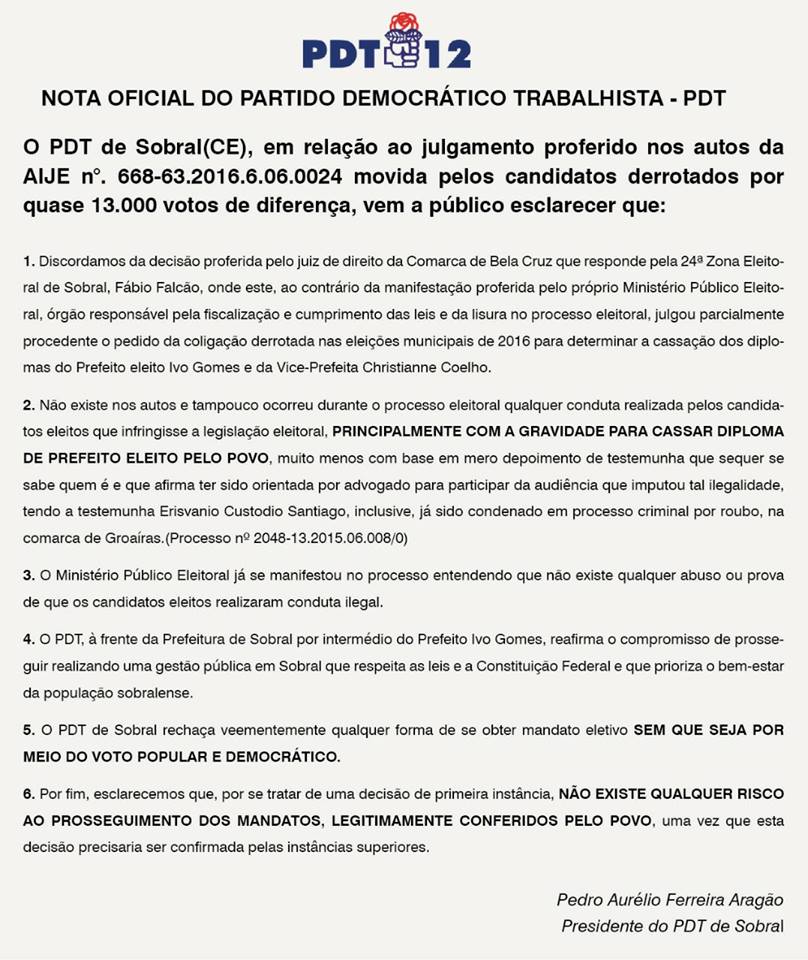PDT de Sobral emite Nota Pública sobre decisão de Juiz contra Ivo Gomes