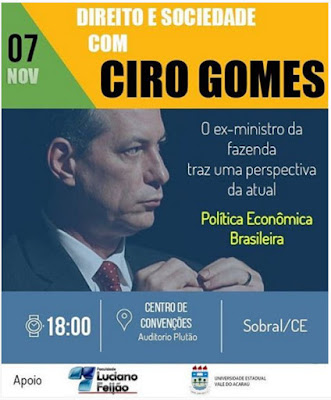O ex-ministro e ex-governador do Ceará, Ciro Ferreira Gomes, será a estrela central do Seminário Direito e Sociedade, oportunidade em que irá tratar com estudantes de Direito da Universidade Estadual Vale do Acaraú (UVA) e da Faculdade Luciano Feijão (FLF) sobre assuntos atuais na esfera da política, economia, sociedade e direito.