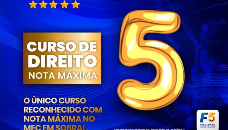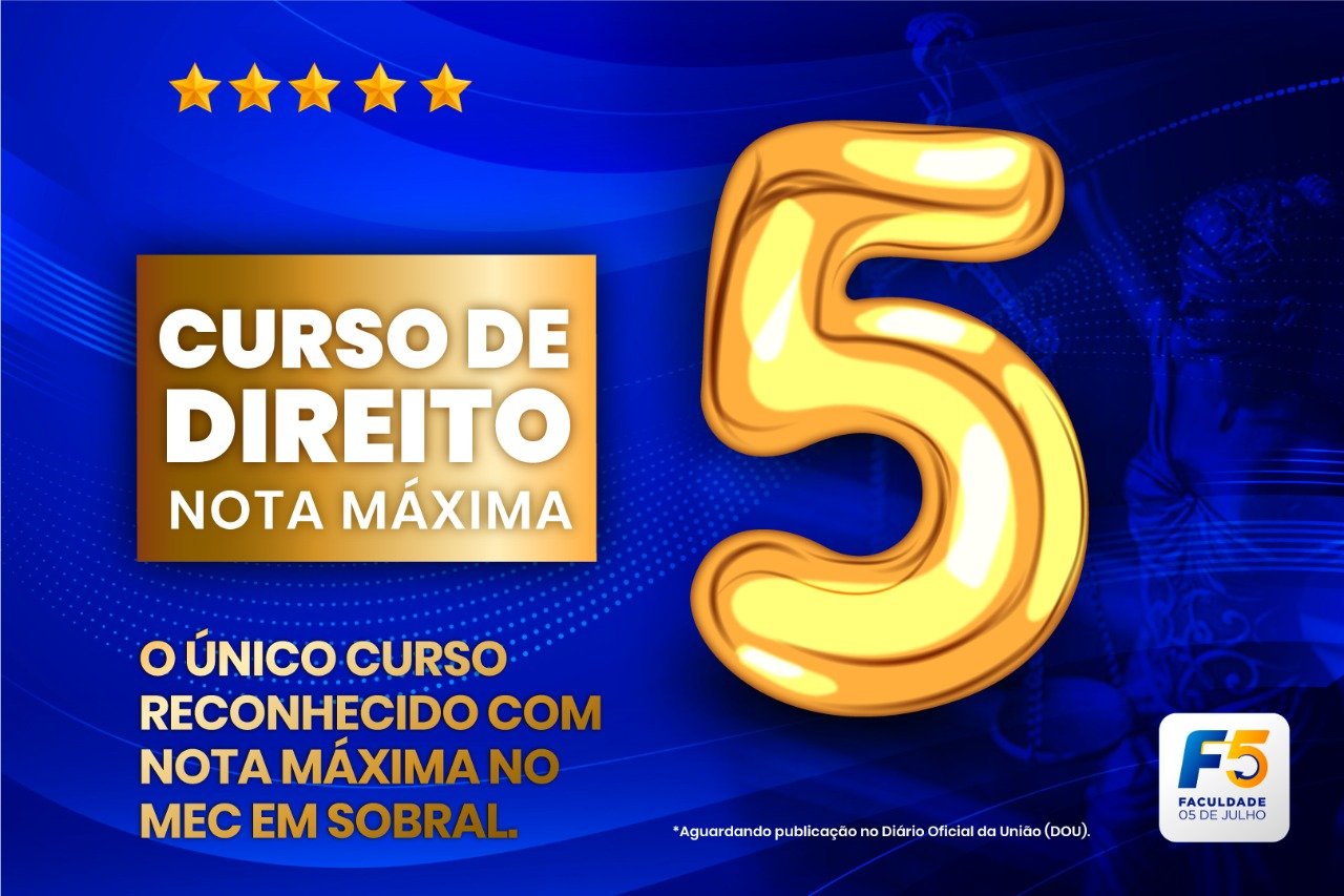 O Curso de Direito da Faculdade 05 de Julho (F5) foi reconhecido pelo Ministério da Educação (MEC) como de excelência, recebendo o conceito máximo-Nota 5, no processo avaliativo que se deu nos dias 17, 18 e 19 de agosto.