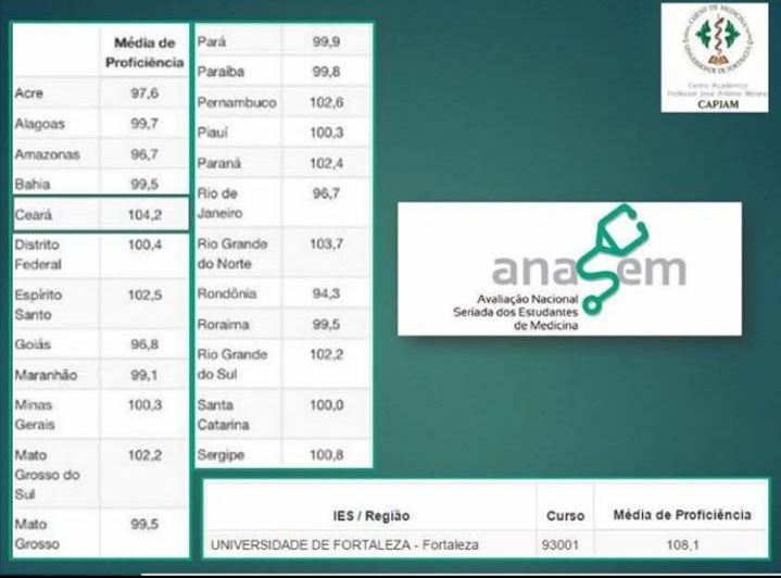 O resultado da Anasem, divulgado na sexta-feira (24), pelo Inep, aponta o Ceará com a melhor média de proficiência no ensino médico do País, com 104,2, e o Curso de Medicina da UFC, campus de Sobral, obteve pontuação acima da média do Ceará, uma das melhores do Brasil, com 104,7. Segundo o coordenador do Curso de Medicina de Sobral/UFC, Prof. Dr. Juvenal Linhares, a conquista é o resultado do esforço de toda comunidade acadêmica.