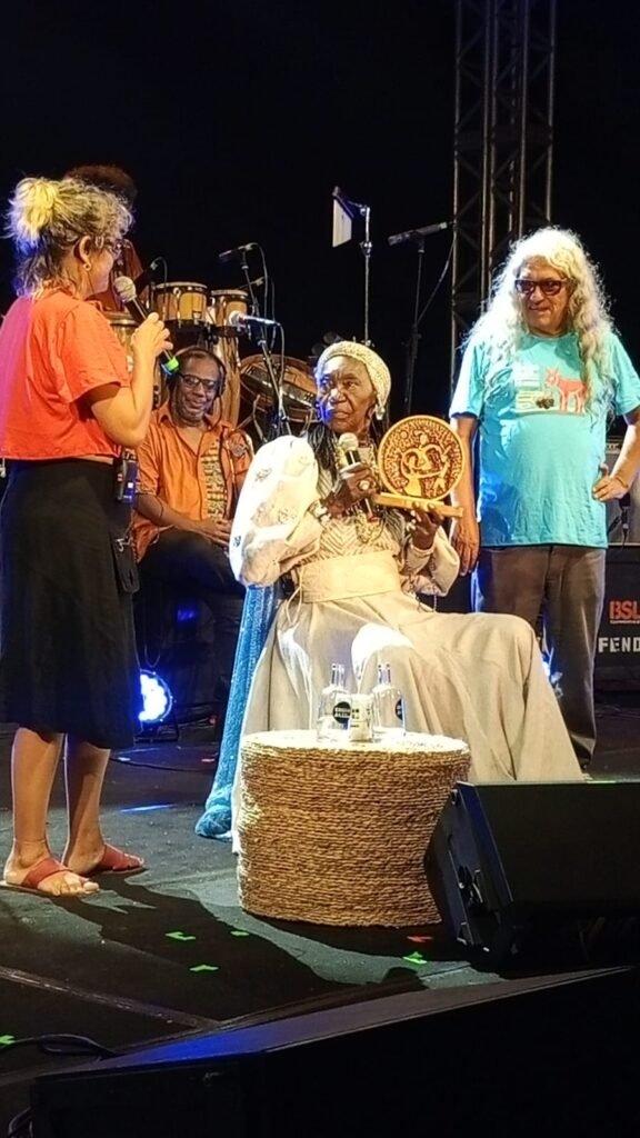 A noite de domingo, despedida do festival, contou com a apresentação arrebatadora das “meninas” do coco de Jeri, que literalmente levantaram o público e dialogaram com a presença de Lia de Itamaracá como artista homenageada do festival e encarregada do último show do festival em 2024.
