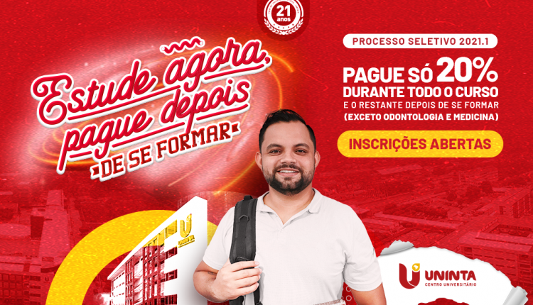 O Centro Universitário Inta (UNINTA) anuncia uma condição inédita para o processo seletivo 2021.1, a campanha “Estude agora, pague depois de se formar”. Nesta campanha, o acadêmico paga apenas 20% durante todo o curso, e o restante após concluir a graduação. A condição é indisponível para Odontologia e Medicina.
