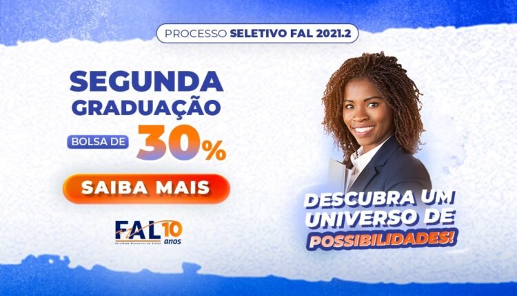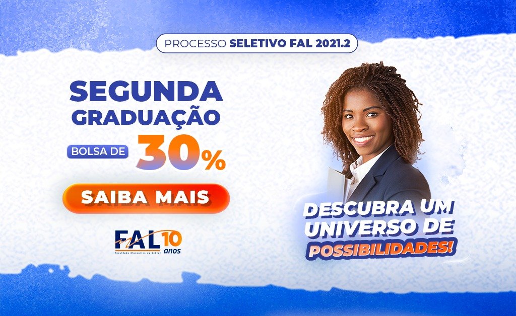 A Faculdade Alencarina de Sobral (FAL) oferece uma excelente oportunidade àqueles que já concluíram o ensino superior e desejam fazer a segunda graduação. Graduados em qualquer IES que efetuarem matrícula no Processo Seletivo 2021.2 terão a disposição 30% de desconto no valor das mensalidades e inscrição isenta .