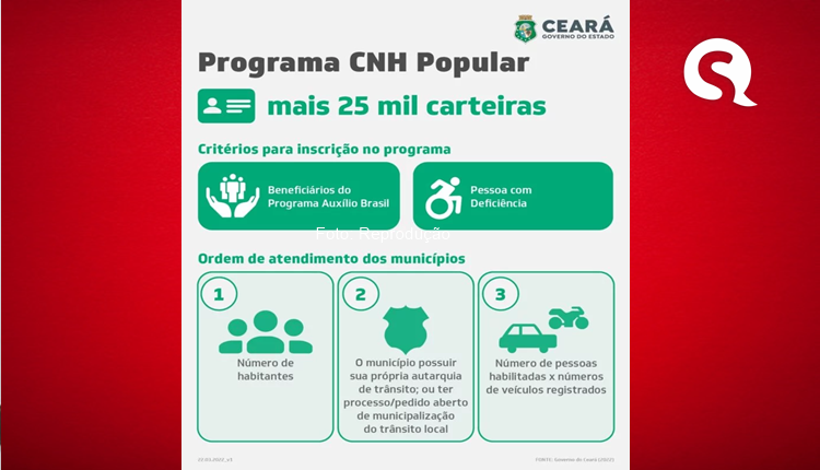 A CNH Popular possibilita o acesso gratuito à primeira Carteira Nacional de Habilitação (CNH) para pessoas de baixa renda, dando o direito à isenção de taxas de prestação dos serviços públicos para emissão da 1ª CNH, tanto para as categorias A (moto) como B (carro). Neste ano, já foram entregues mais de 10 mil habilitações. A população cearense será beneficiada com mais 25 mil CNH’s. Em breve serão divulgadas mais informações.
