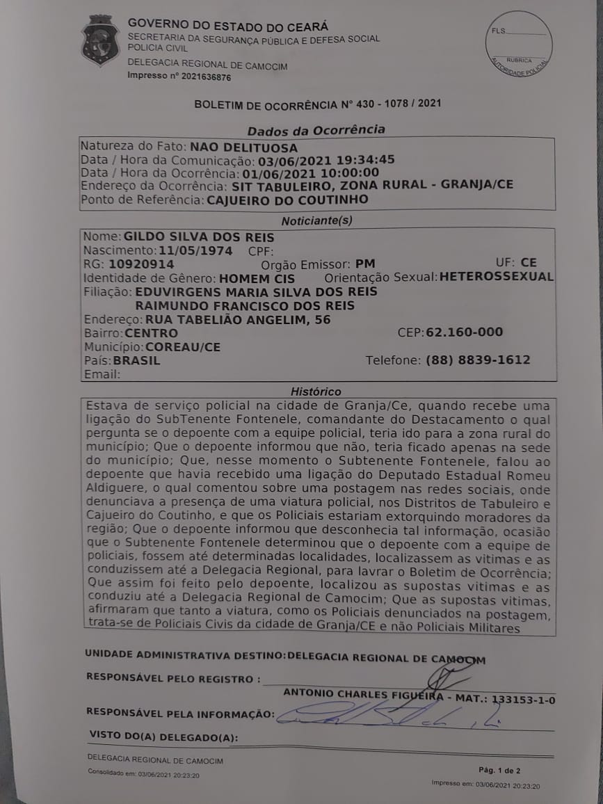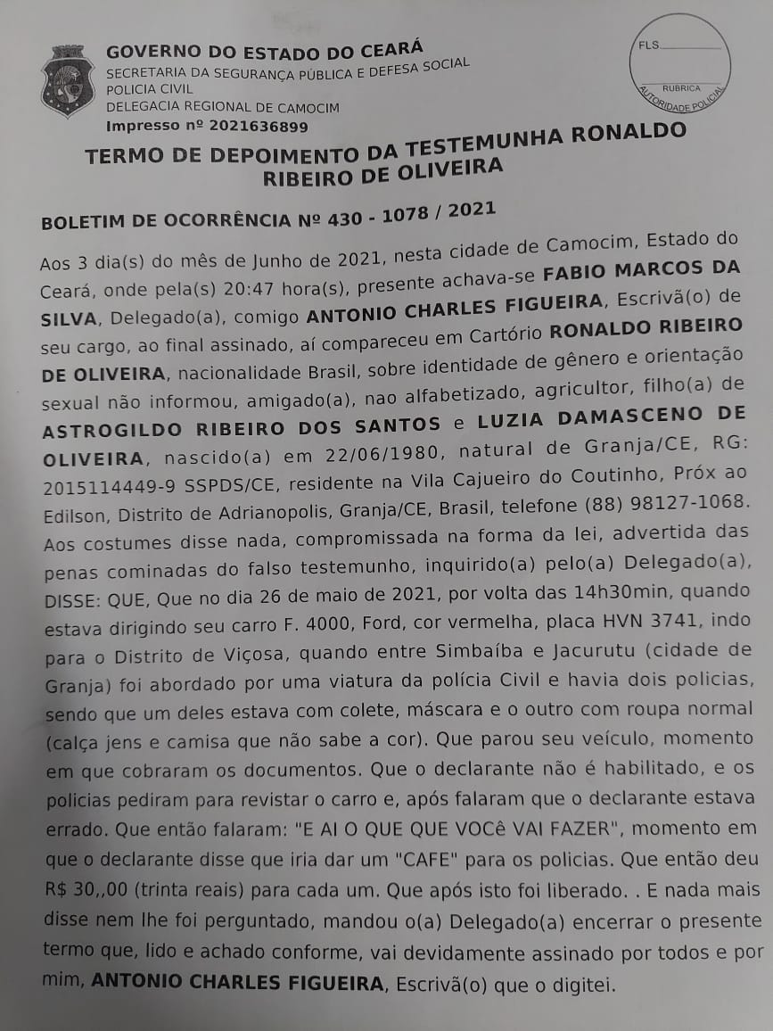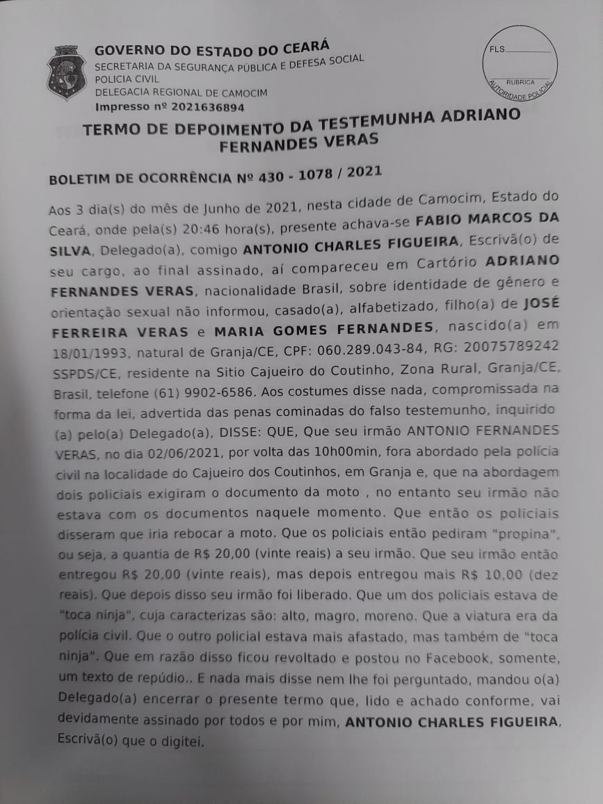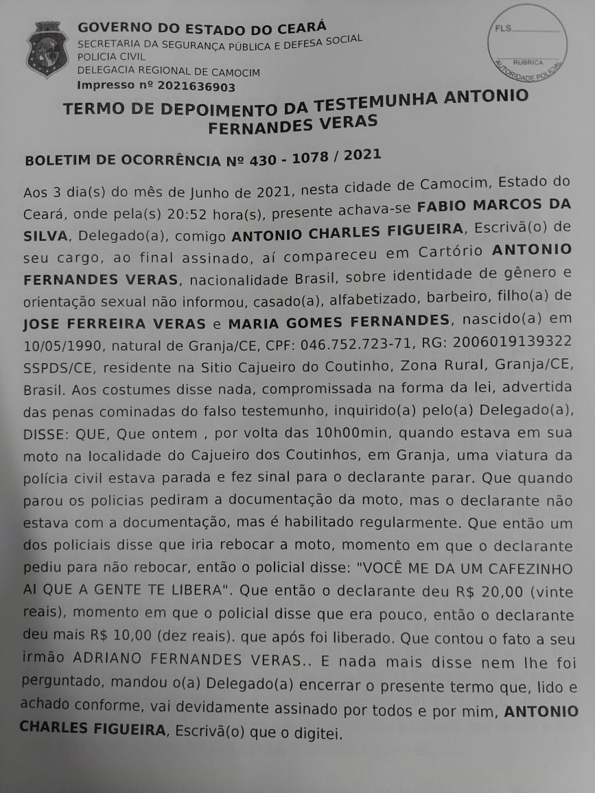 Mais de 06 granjenses protocolaram denúncias na Delegacia Regional de Camocim contra crime de concussão e extorsão promovidos por 02 inspetores da polícia Civil de Granja, que estiveram nas últimas 72h nas localidades de Adrianopolenses, Cajueiro dos Coutinhos, Timonha, Jacurutu, Santa Terezinha, agindo como se fossem da Polícia Rodoviária Estadual, abordando, com arma em punho, motoristas, solicitando documentação pessoal, dos veículos e dinheiro para liberar os motoristas nos caso de documentações em atraso.