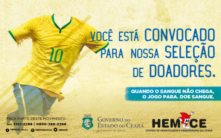Com o objetivo de preparar os estoques de sangue para os períodos de Copa do Mundo, festas juninas e férias, o Hemoce lançou no último dia 14 de junho, Dia Mundial do Doador, uma nova campanha para incentivar as doações. Com o tema “Quando o Sangue Não Chega, o Jogo Para”, uma alusão ao mundial de futebol que acontece na Rússia, a seleção é formada pelos doadores de sangue que estão convocados a entrar em campo. Desta forma, o Hemoce destaca que a solidariedade é como um jogo de futebol, no qual o time convocado precisa manter o jogo, ou seja, continuar doando para ganhar a partida. O material foi desenvolvido voluntariamente pela agência Flex And Comunicação.