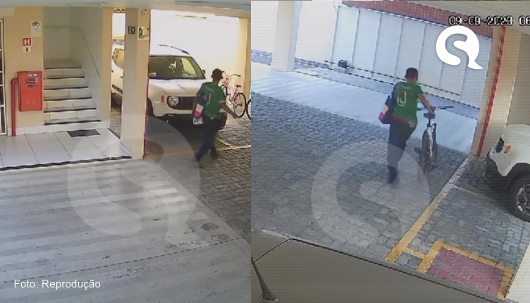 As imagens mostram o momento que o suspeito abre o portão eletrônico, entra no estacionamento e pega a bicicleta de um dos moradores do local. Em seguida sai do condomínio com a bicicleta e foge.