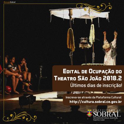 A Prefeitura de Sobral, por meio da Secretaria da Cultura, Juventude, Esporte e Lazer (Secjel), informa que as inscrições para o edital de ocupação do Theatro São João se encerram às 17 horas dessa terça-feira (21/08). Podem participar artistas (solo ou em grupo), coletivos, companhias e associações. As inscrições são realizadas exclusivamente pela internet, através da plataforma “Mapas Culturais – Sobral Cultura”. O resultado será divulgado dia 27 de agosto, após análise técnica dos projetos, de acordo com o cronograma expresso no edital.