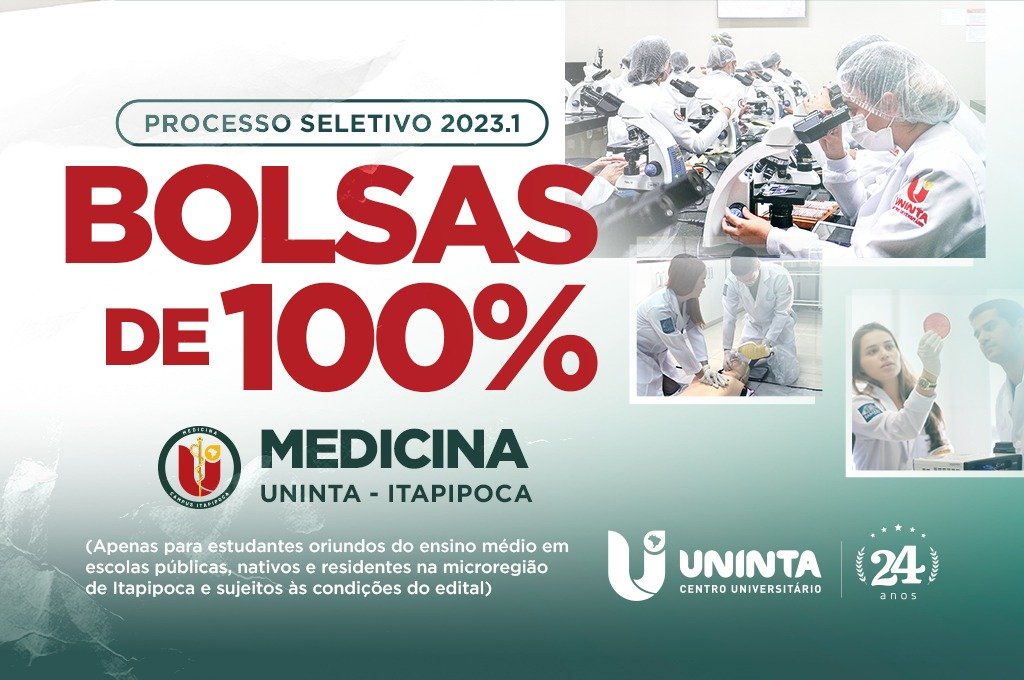 O Centro Universitário Inta (UNINTA) torna público o edital de seleção para o preenchimento de 05 (cinco) vagas com bolsas integrais para o curso de Medicina Campus Itapipoca. As inscrições estão abertas e devem durar até o dia 14 de fevereiro de 2023 pelo link uninta.vc/bolsasitapipoca