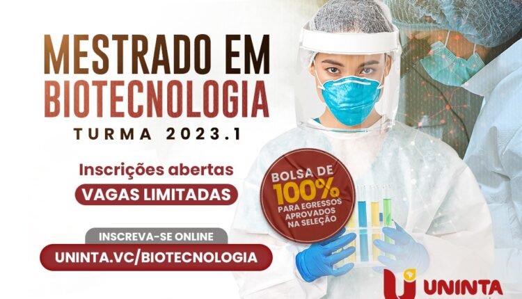 A coordenação do Programa de Mestrado em Biotecnologia do Centro Universitário Inta (UNINTA) informa a abertura das inscrições para seleção de nova turma. Serão preenchidas um total de 10 vagas para o semestre 2023.1. Os interessados devem se inscrever até o dia 20 de janeiro de 2023.