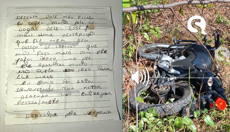 Uma moto furtada foi encontrada, neste domingo (11), na cidade de Camocim, no Litoral Oeste do Ceará, com um bilhete escrito pelo pai do suspeito do crime. No bilhete, o pai pede desculpas pelo comportamento do filho e expressa seu sofrimento pela situação.