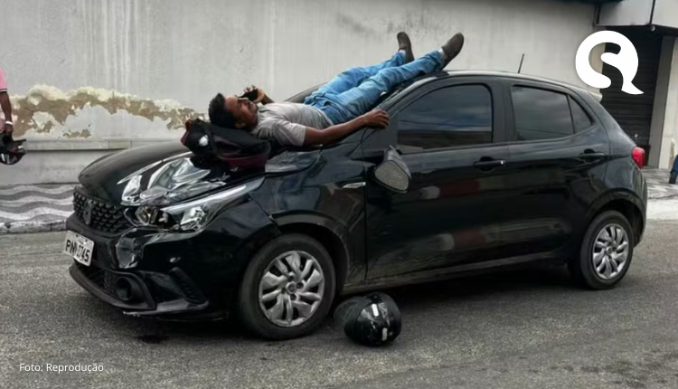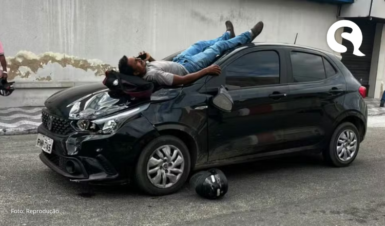 Um motociclista caiu sobre um capô de um carro após bater no veículo em um cruzamento no Centro de Pacajus, na Região Metropolitana de Fortaleza, na manhã desta quinta-feira (7). Mesmo ferido, o homem usou o celular para fazer uma ligação enquanto aguardava pela ambulância.