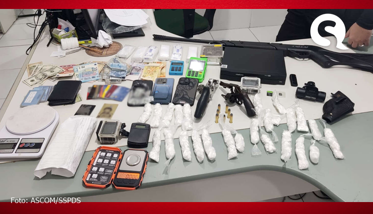 Além do mandado de prisão, foi cumprido um mandado de busca e apreensão na residência do suspeito. Durante as buscas, foram encontradas em fundos falsos, três armas de fogo, munições, 570 gramas de cocaína, cartões, dinheiro nacional e internacional, e outros materiais.