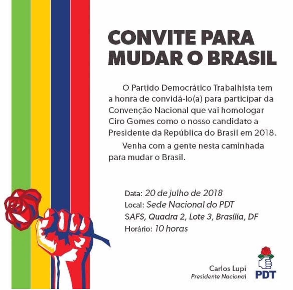 O presidente nacional do PDT, Carlos Lupi, lançou edital onde convoca a todos os membros do Diretório Nacional – Conselho Político, presidentes dos movimentos, senadores, deputados federais e estaduais, delegados e presidentes das comissões provisórias – para a Convenção Nacional do partido, que será realizada no dia 20 de julho, na Sede Nacional do PDT, em Brasília, a partir das 11h. O encontro irá confirmar o nome de Ciro Gomes à presidência da República nas eleições de outubro.