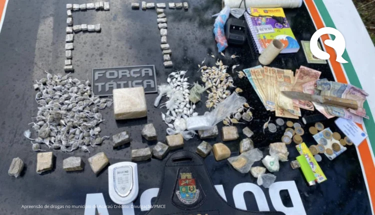 A equipe da Força Tática da Polícia Militar do Ceará (PMCE) apreendeu 864,8 gramas de drogas na localidade de Lagoa do Mato, em Acaraú, a 233 quilômetros de Fortaleza. O caso foi registrado nesse sábado, 8. Segundo a PMCE, a viatura da Força Tática foi acionada para verificar uma denúncia de tráfico de drogas na localidade de Lagoa do Mato.