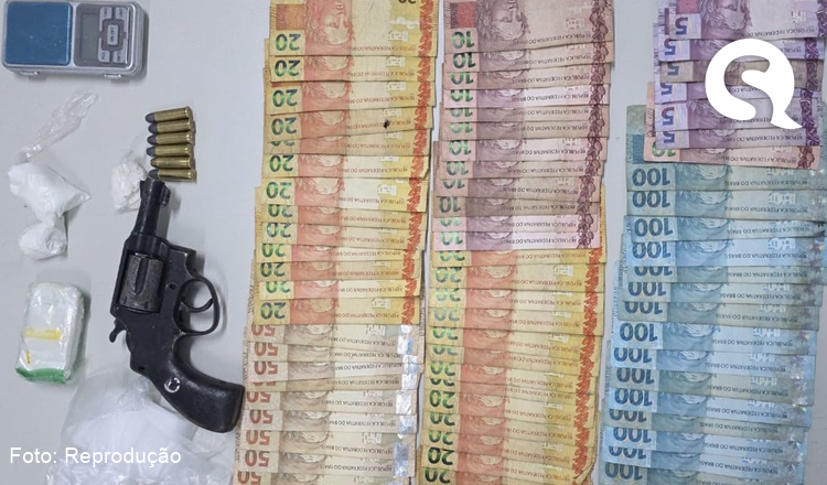Durante as buscas, os policiais localizaram o material dispensado: um revólver calibre .38 com seis munições intactas, cerca de 40 gramas de cocaína, uma balança de precisão, 40 unidades de sacos plásticos tipo “dindim”, um smartphone e a quantia de R$ 3.460 em espécie.