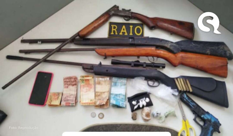 Diante da suspeita, a equipe solicitou autorização para entrada na residência, onde foi localizado uma espingarda tipo cartucheira calibre 36, duas armas artesanais do tipo socadeira, uma carabina de pressão calibre 5,5 mm, além de um simulacro de pistola. Também foram apreendidos entorpecentes — sendo 46,3 gramas de crack, 2,6 gramas de cocaína e 11,7 gramas de maconha — embalagens plásticas para comercialização, e a quantia de R$ 653,50 em espécie. Ainda na propriedade, os policiais encontraram sete gaiolas contendo aves silvestres, mantidas ilegalmente em cativeiro, configurando crime ambiental.
