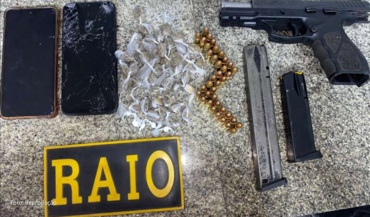 Ao chegarem ao endereço, os militares se depararam com um casal em frente à residência. Ao notar a aproximação da viatura, a mulher dispensou um saco e ambos entraram rapidamente na casa. Os policiais realizaram a abordagem e, ao verificarem o conteúdo do material dispensado, apreenderam 45 papelotes (maconha e cocaína). Ainda durante buscas no imóvel, foi encontrada uma pistola calibre 9mm com 38 munições, além de dois aparelhos celulares.