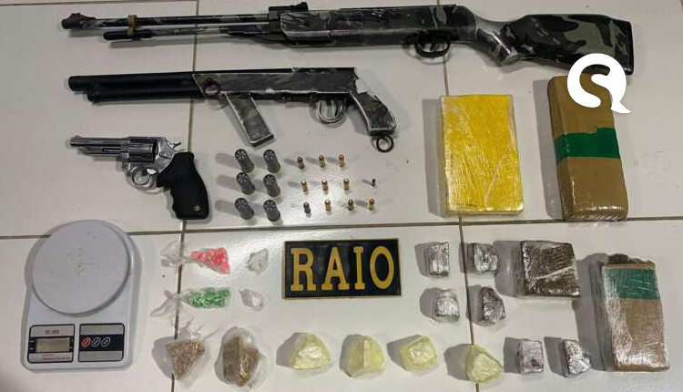 Os raianos foram acionados para checar uma ocorrência de tráfico de drogas no bairro Bailarina. De posse das informações, a composição do CPRaio diligenciou até um imóvel abandonado, onde foram encontrados: um quilo e 200 gramas de cocaína, um quilo e meio de maconha, 100 g de crack e 20 comprimidos de ecstasy. Além dos entorpecentes, um rifle calibre 22, uma espingarda calibre 12, um revólver calibre 38, uma prensa hidráulica com capacidade de 30 toneladas, uma balança de precisão e 17 munições também foram apreendidos.