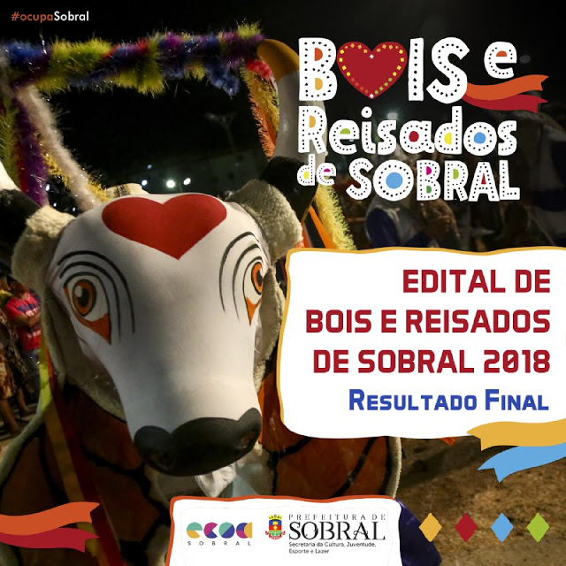 A Prefeitura de Sobral, por meio da Secretaria da Cultura, Juventude, Esporte e Lazer (Secjel) e Escola de Cultura, Comunicação, Ofícios e Artes (Ecoa), divulgou o resultado final do edital Bois e Reisados de Sobral 2018. O Projeto será desenvolvido no período de 06 a 31 de janeiro e selecionou 10 grupos de Bois e Reisados adultos e infantis em todo o Município.