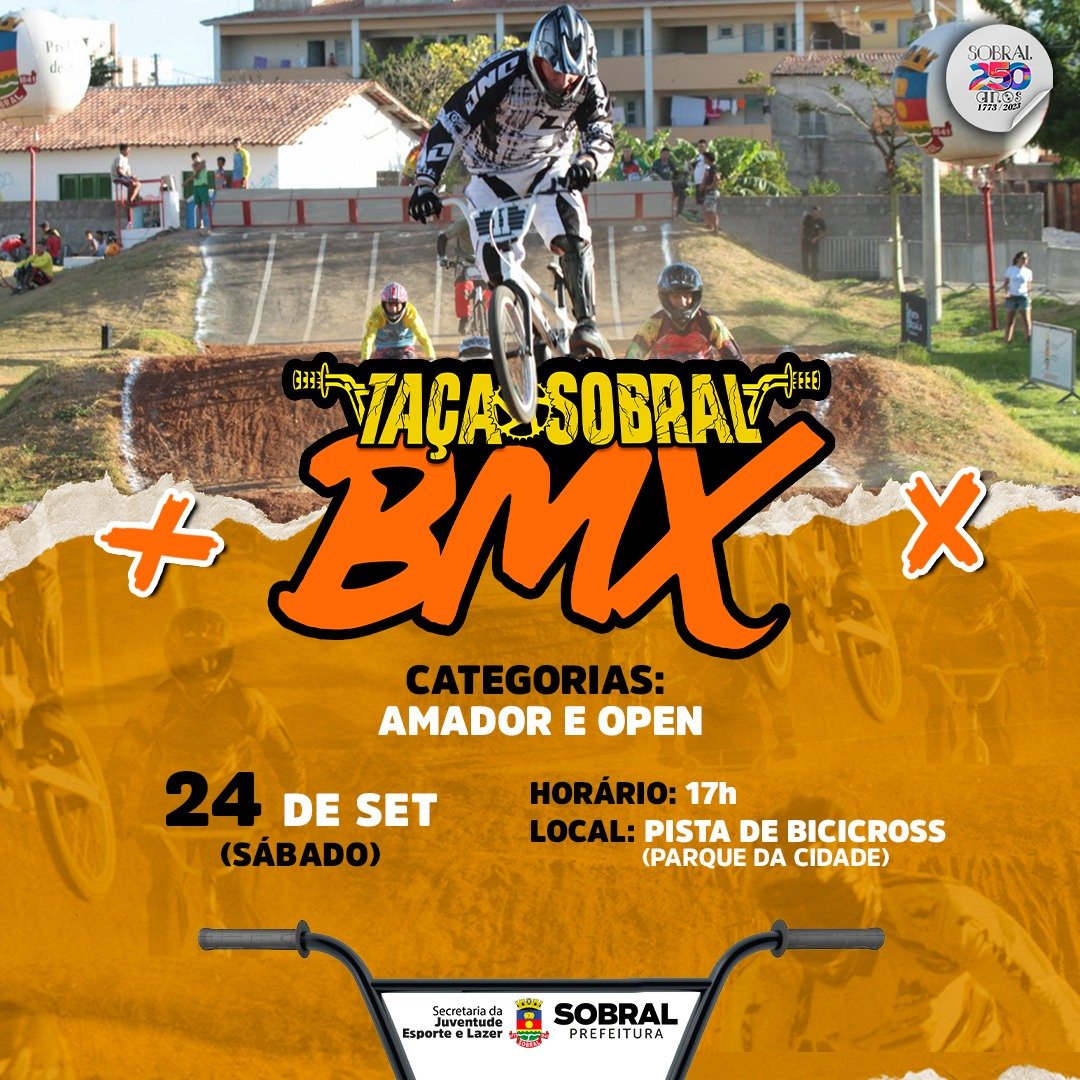 A Prefeitura de Sobral, por meio da Secretaria da Juventude, Esporte e Lazer (Secjel), realizará, no dia 24 de setembro, a partir das 17h, a Taça Sobral de BMX 2022, na pista de bicicross do Parque da Cidade, localizada no bairro Expectativa.