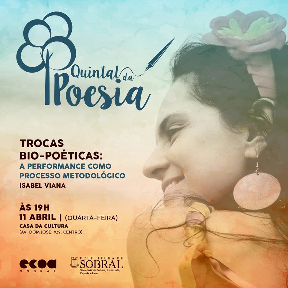 O programa Quintal da Poesia uma proposta em Literatura que promove encontros e desdobramentos de escritores e apreciadores dessa arte. Nesta quarta (11), realiza mais uma edição na Casa da Cultura, às 19h, com a oficina “Trocas Bio-Poéticas: a performance como processo metodológico”, orientada por – Isabel Cristina Viana (Fortaleza).