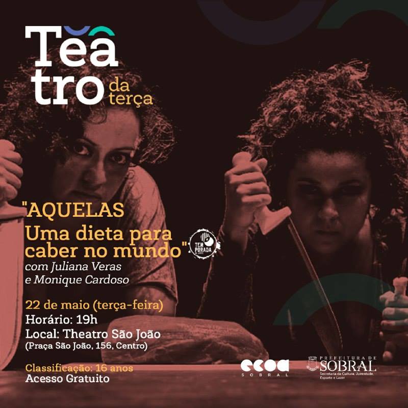As atrizes Juliana Veras e Monique Cardoso sobem ao palco no Theatro São João de Sobral para apresentar o espetáculo “Aquelas – Uma dieta para caber no mundo”. A encenação acontece no dia 22 de maio (terça-feira), às 19 horas . O público é convidado a construir a peça que trata das questões em torno de ser mulher na sociedade contemporânea.