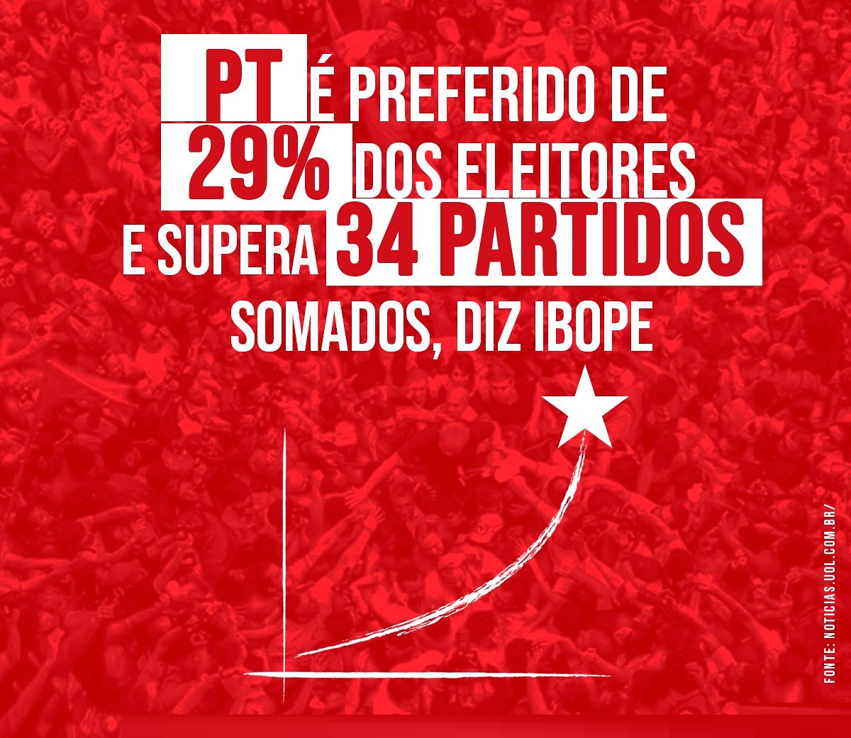 O PT é o partido preferido de 29% da população brasileira, segundo pesquisa Ibope divulgada nesta segunda-feira (20). O índice supera os 27% que, somados, escolheram as outras 34 legendas registradas no TSE (Tribunal Superior Eleitoral).