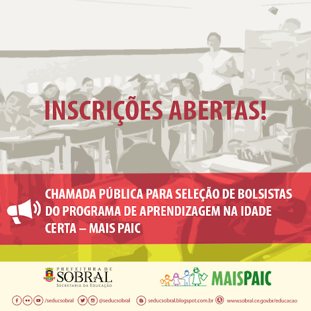 A Secretaria da Educação de Sobral está realizando chamada pública de professores para composição do banco de bolsistas do Programa de Aprendizagem na Idade Certa – MAIS PAIC. O interessado tem até o dia 5 de março para se inscrever e deve ter formação na área da Educação e experiência comprovada na Educação Básica por, no mínimo, dois anos.