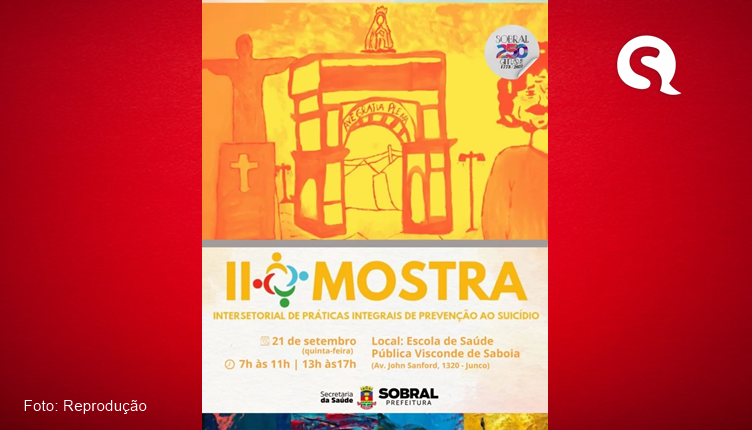 A Secretaria da Saúde de Sobral, por meio da Coordenadoria da Atenção Psicossocial e Escola de Saúde Pública Visconde de Saboia (ESP-VS), promoverá a II Mostra Intersetorial de Práticas Integrais de Prevenção ao Suicídio, na quinta-feira (21/09), na ESP-VS, das 7h às 11h e das 13h às 17h.