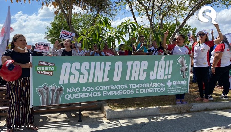 Trabalhadores e representantes do Sindicato dos Empregados em Estabelecimentos de Serviço de Saúde no Estado do Ceará (Sindsaúde), protestam na manhã desta quarta-feira (09), na frente da Diocese de Sobral, região Norte do Estado, em prol da assinatura do Termo de Ajustamento de Conduta (Tac) para regularizar a situação da Santa Casa perante a Prefeitura da cidade.