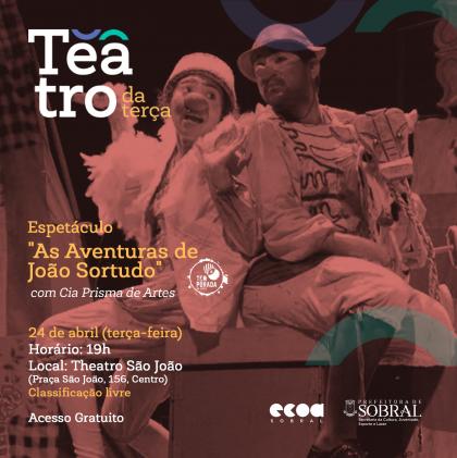 Nesta terça-feira (24/04), às 19 horas, o espetáculo “As aventuras e descobertas do ingênuo João Sortudo” ganha o palco do Theatro São João numa adaptação do conto popular de domínio público pela Cia. Prisma de Artes (Fortaleza), utilizando-se de uma linguagem repleta de ludicidade, fantasia e musicalidade.