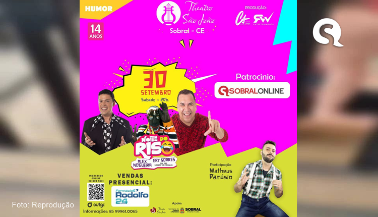Prepare-se para um espetáculo que vai fazer você rolar de rir! No dia 30 de setembro, o Teatro São João se transformará no palco das gargalhadas, com o show NOITE DO RISO com Alex Nogueira e Ery Soares com Tizil das Garras da Patrulha. Com participação do nosso talento de Sobral Mateus Parúsio.