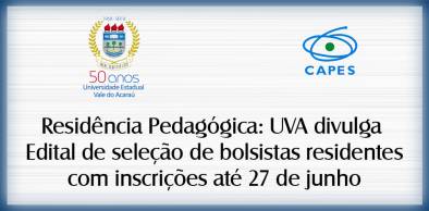 A Pró-Reitoria de Ensino de Graduação da Universidade Estadual Vale do Acaraú (PROGRAD/UVA) estará recebendo até o próximo dia 27 de junho de 2018, inscrições de candidatos a bolsistas e formação de Cadastro Reserva ao Programa Institucional de Residência Pedagógica (RP/UVA2018) na modalidade Residente. O Edital do Processo Seletivo Simplificado foi divulgado na segunda-feira, 18 de junho de 2018, e oferece 264 vagas em onze cursos de licenciatura da UVA.